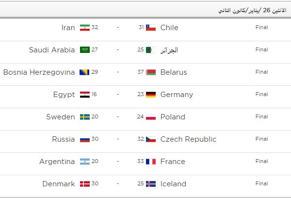 نتائج مباريات بطولة العالم لكرة اليد ليوم الاثنين ومواعيد مباريات غدا الثلاثاء 27 جاتفي