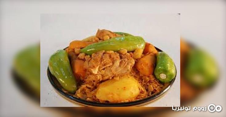 نقطع الدجاجة و نتبلها بالفلفل الأسود و الملح ثمّ نحمي الزيت و نقليها حوالي 5 دقائق، نضيف البصل، الحمص، الطماطم، فلفل الزينة، البطاطا، الفلفل و نمرق بلتر و نصف من الماء.