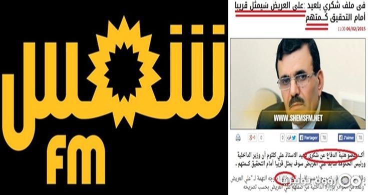 العنوان يوحي من الوهلة الأولى ، أن جهة رسمية أو قضائية سربت "خبر" اتخاذ السلطة القضائية "قرار" - أو "اعتزامها" اتخاذ قرار "- باستدعاء العريض كمتهم" في قضية اغتيال شكري بالعيد..لكن و بمجرد تجاوز "العنوان المشبوه" ، و قراءة الأسطر الأولى "للخبر" يتبين أن "شمس أف أم" و من حرر المقال و من "أشر على الخبر" من رئاسة تحرير الإذاعة ، تلاعبوا بعقول ألاف أو لنقل عشرات الآلاف من التونسيين من خلال صياغة عنوان أقل ما يقال عنها أنها صياغة "لا مهنية" و مُوجهة ..فمحتوى الخبر يتحدث عن تصريح لأحد أعضاء ما يسمى بهيئة الدفاع عن الفقيد شكري بالعيد أكد فيه أن "الهيئة" "طالبت" بتوجيه التهمة للعريض و عدد من كوادر وزارة الداخلية..(من كتب الخبر نسي أن يذكر طبيعة التهمة... !!) .