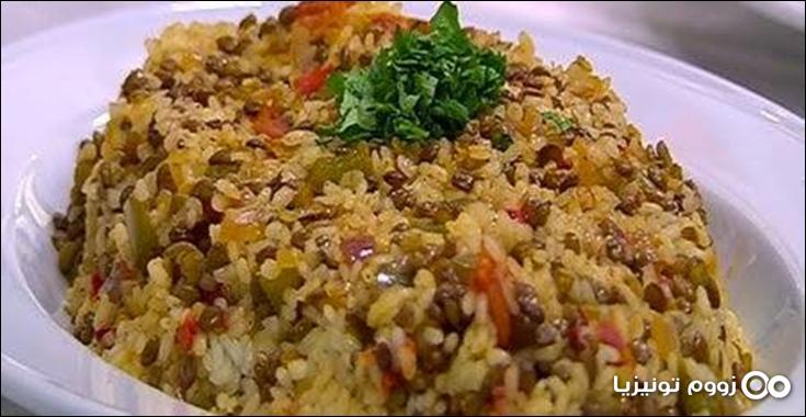 أضيفي الأرز لخليط العدس وقلّبي ثم صبّي الأرز بالعدس في طبق التقديم وزيني الوجه بعود البقدونس.