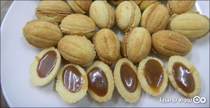 تخرج أنصاف الجوزة من القالب و تملأ بالكارامال ويتم الصاق كل نصفي حبة جوزة.