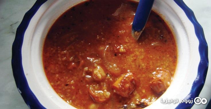 وفي طنجرة أخرى نصب فنجان زيت ونضع البصل مع قطع القرنيط مع طماطم كعب مقصوصة، مع الحمص والفلفل أخضر مقصوص، مع طماط المعجون والهريسة، والتابل، والملح والثوم ويُقلّى الجميع على نار هادئة ثم نمرق بالماء الدافئ.