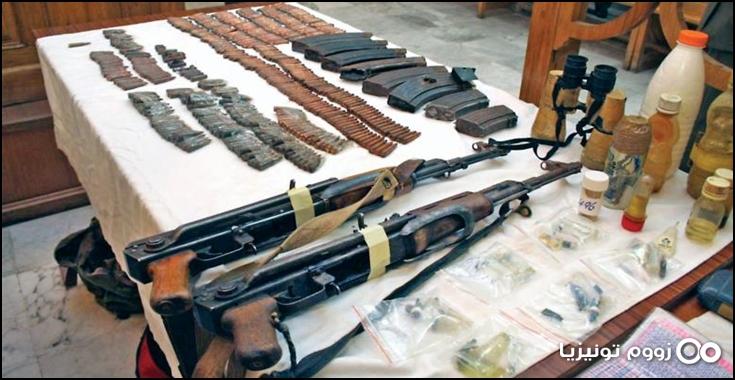 حيث تم العثور بعد مداهمة إحدى المنازل بمنطقة سوق الجديد بسيدي بوزيد على سلاح كلاشينكوف و حزام ناسف و رمانة يدوية و مخازن سلاح و 250 خرطوشة .