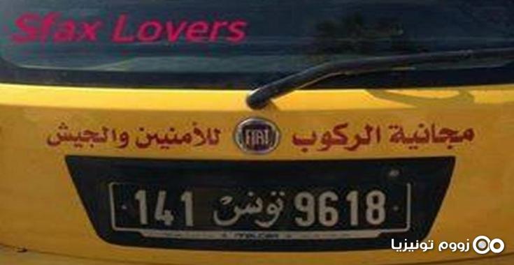 تداولت عديد المواقع الاجتماعية اليوم صورة لسيارة "تاكسي" كتب عليها "مجانية الركوب للأمنيين والجيش" حيث أعلن صاحب هذه السيارة اعتزامه نقل الوحدات الأمنية والعسكرية مجانا ودون اي مقابل وذلك ببادرة منه على خلفية الأحداث الأخير التي شهدتها مدينة بن قردان وصمود قواتنا الامنية والعسكرية أمام العناصر الارهابية.