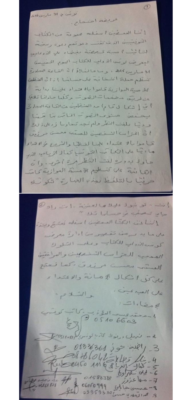 وفي ما يلي نصّ البيان وقائمة القصّاصين الذين تمّ الاعتداء عليهم من طرف حرّاس مرزوق :