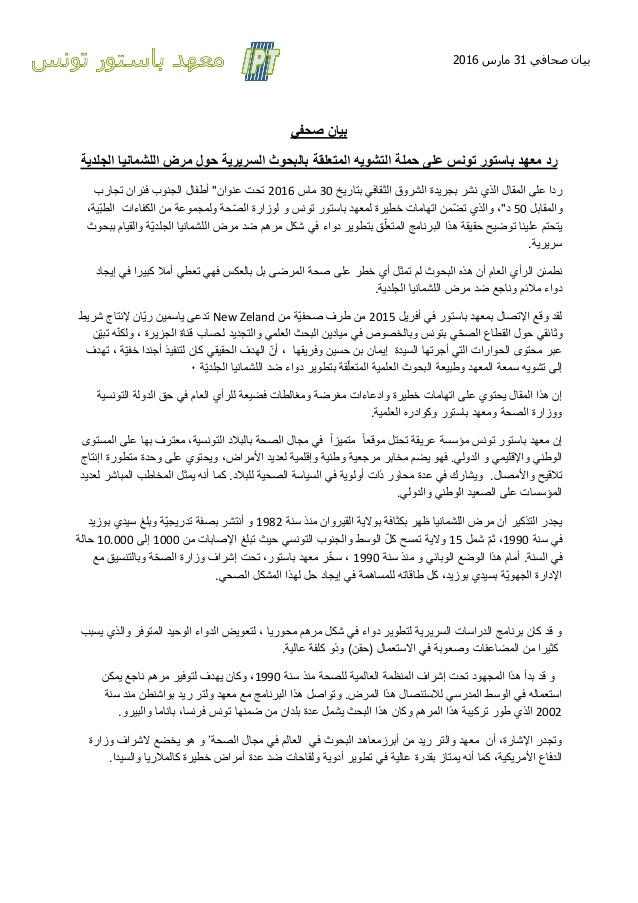 وفي هذا الخصوص، أصدر معهد باستور بيانا، يوم أمس الخميس 31 مارس 2016، ردّ فيه على هذه الاتهامات، حيث نفى المعهد وجود أي خطر على صحة المرضى للبحوث السريرية المتعلقة ببرنامج تطوير دواء في شكل مرهم ضد الليشمانيا الجلدية.