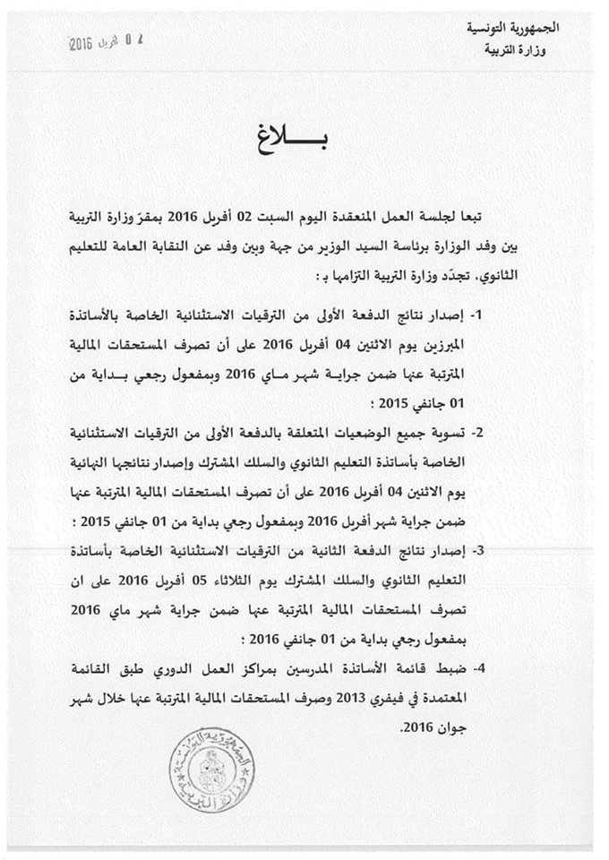وقد تمّ خلال الجلسة التوصل إلى اتفاق بين الطرفين، جدّدت فيه وزارة التربية التزامها بأربعة نقاط وفق ما هو وراد في البلاغ التالي :