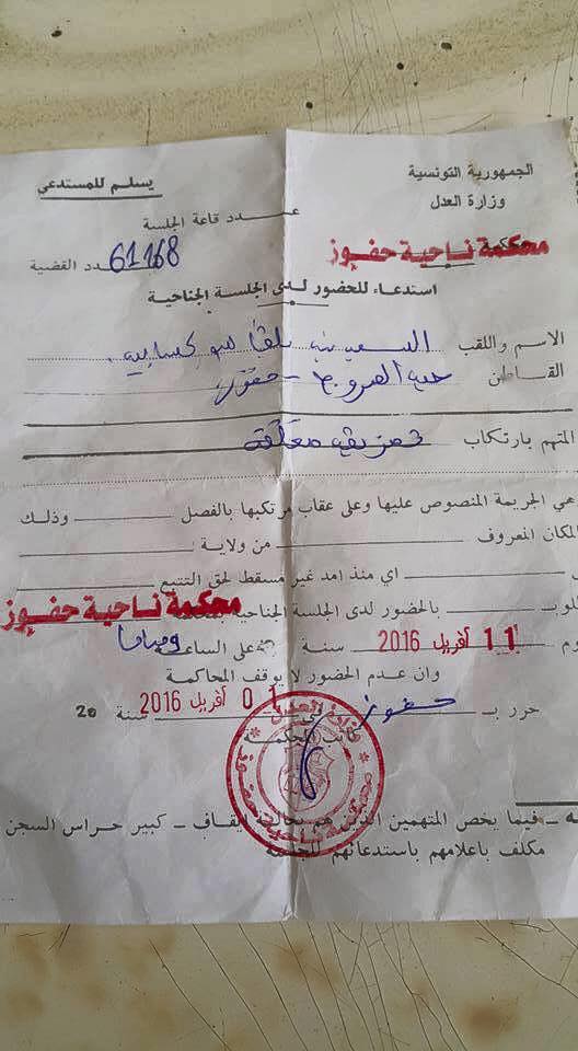 ويأتي ذلك بتهمة ارتكبها والمتمثلة في تمزيق مُعلّقة أكّدت المحامية ليلى حداد أنّها صورة صغيرة لرئيس الجمهورية الباجي قائد السبسي وجدها مُلقاة في الشارع خلال فترة الانتخابات الرئاسية.