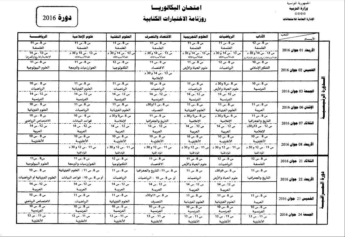 وجاء في منشور وزارة التربية التي أصدرته بتاريخ 03 نوفمبر 2015، أنّ امتحان الباكالوريا سنة 2016، في دورته الرئيسية ينطلق ابتداء من غرة جوان إلى غاية الثامن من نفس الشهر على أن يتم الاعلان عن النتائج يوم 18 جوان 2016، مبيّنة أنّ دورة المراقبة تكون أيام 21 و24 جوان حيث يتمّ الاعلان عن نتائجها يوم 02 جويلية 2016.