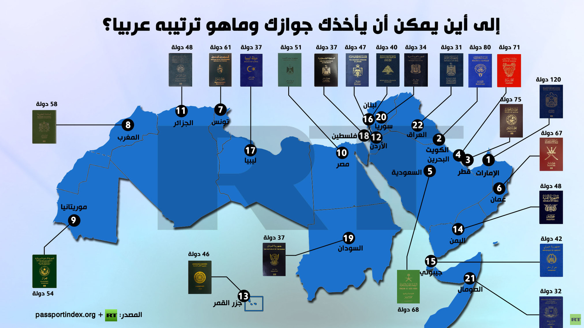 نشرت روسيا اليوم "إنفوجرافيك" يبيّن عدد الدول التي يمكن أن يأخذك جواز سفرك إليها.