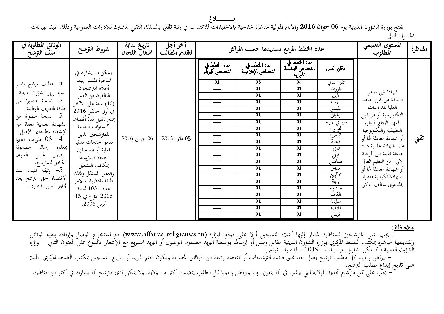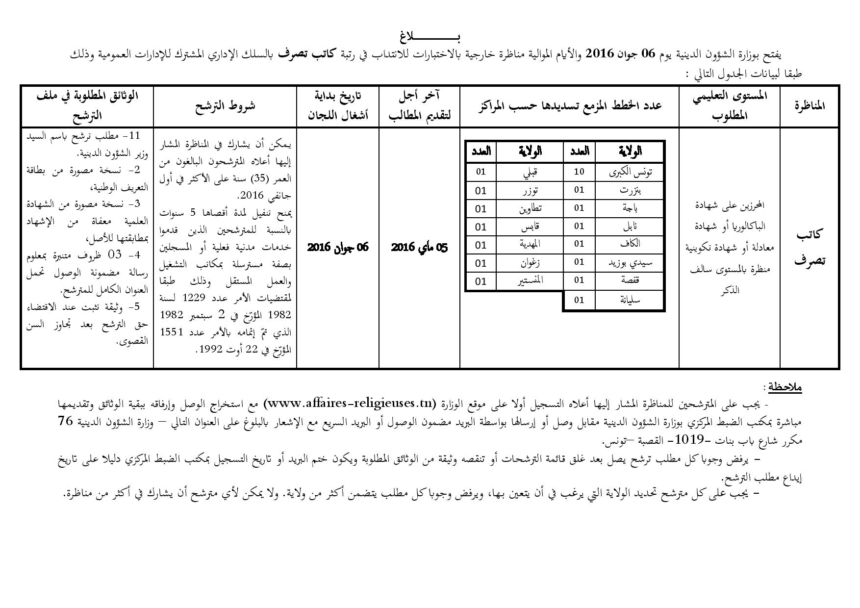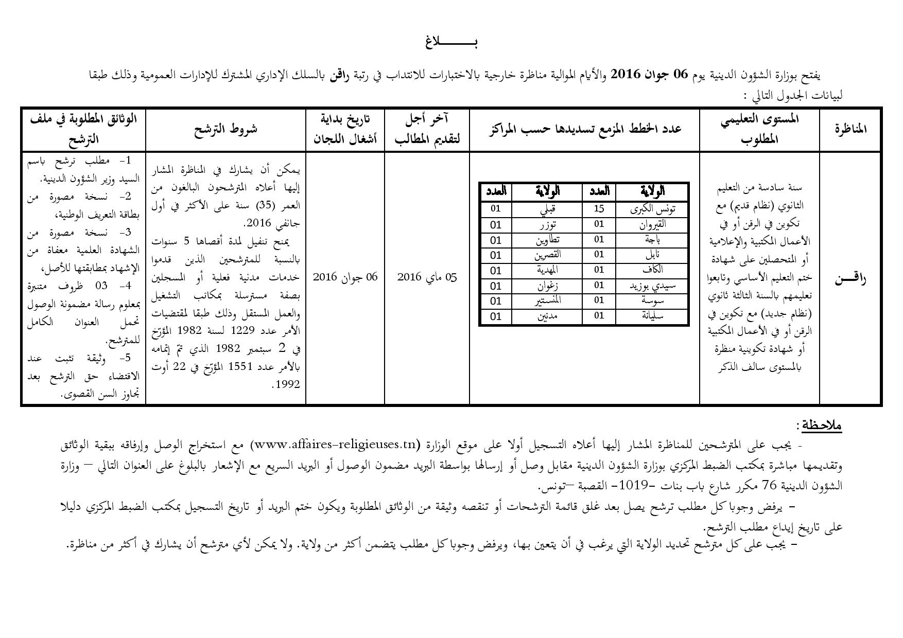 وأضافت الوزارة أنّ التسجيل في هذه المناظرات، والبالغ عددها سبعة، قد انطلق منذ يوم أمس الخميس، 14 أفريل 2016، ويتواصل إلى غاية يوم السبت، 14 ماي 2016، مُشيرة إلى أنّ الأماكن الشاغرة يتوزّع بهذا الشّكل :