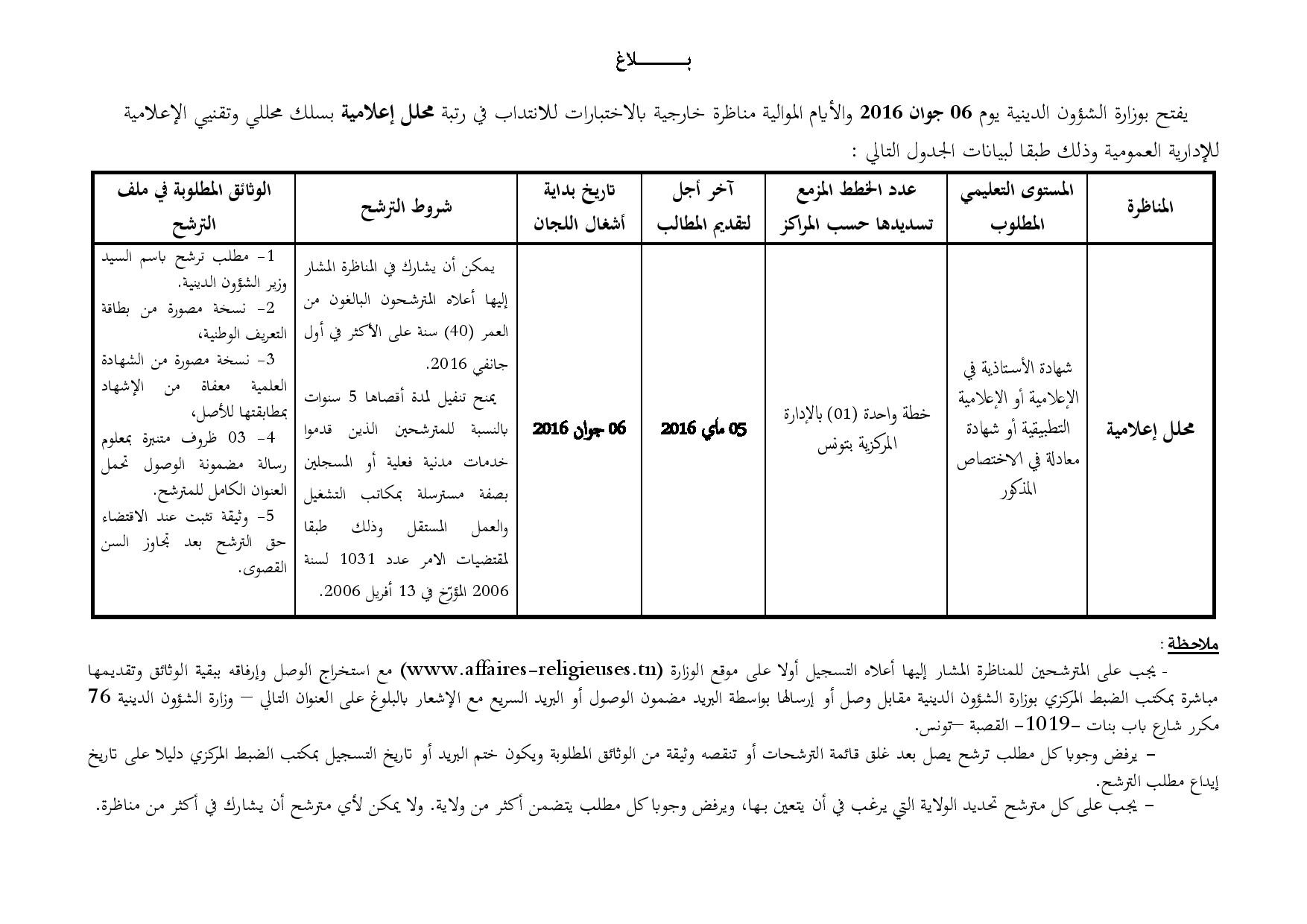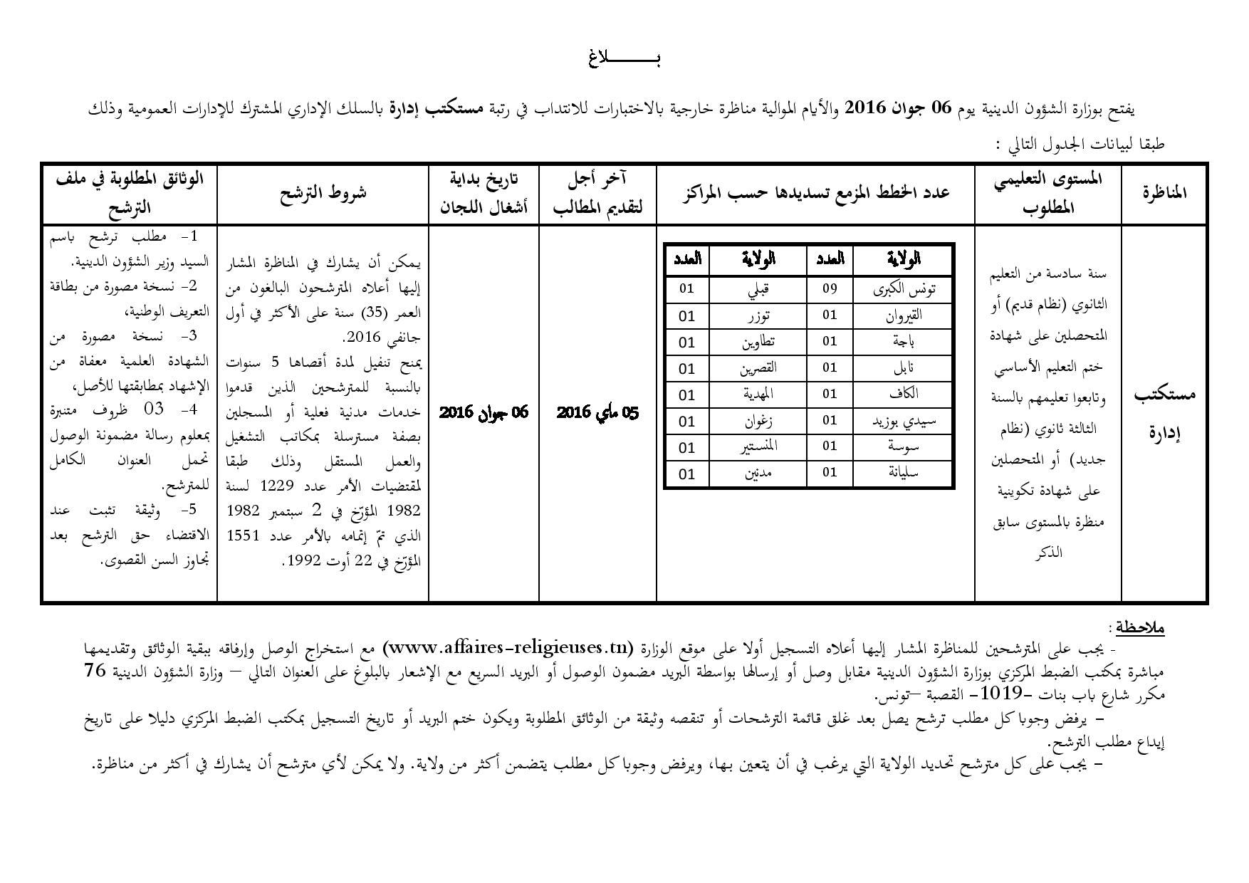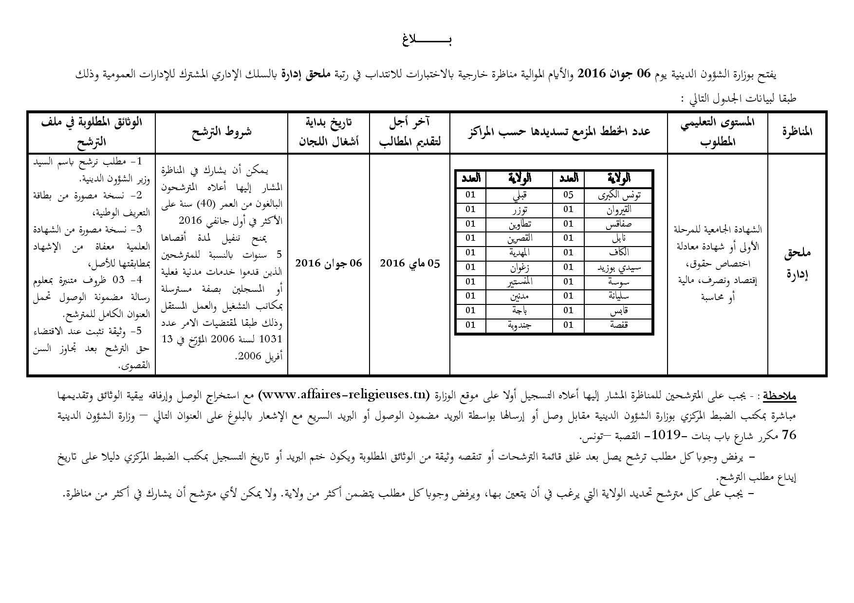 وأضافت الوزارة أنّ التسجيل في هذه المناظرات، والبالغ عددها سبعة، قد انطلق منذ يوم أمس الخميس، 14 أفريل 2016، ويتواصل إلى غاية يوم السبت، 14 ماي 2016، مُشيرة إلى أنّ الأماكن الشاغرة يتوزّع بهذا الشّكل :