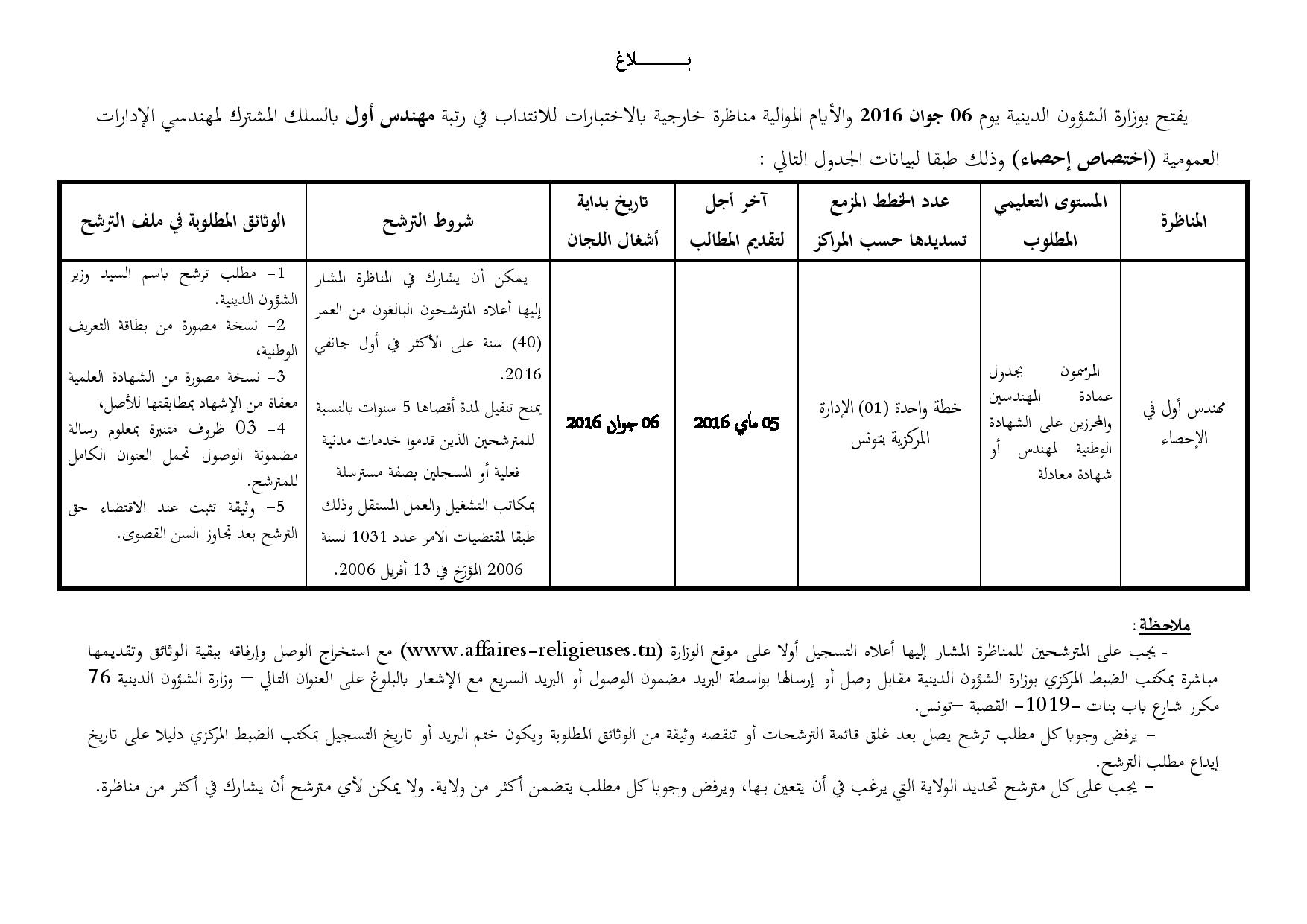 - مناظرة خارجية بالاختبارات للانتداب في رتبة مهندس أوّل بالسلك المشرتك لمهندسي الإدارات العمومية (اختصاص إحصاء). ( خطة واحدة)