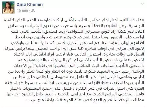 وقالت الخميري، في تدوينة لها على الفايسبوك اليوم السبت 16 أفريل الجاري، أنّها ربما تستحق مثولها للمجلس لأنّها واضبت على الحضور بينما ينعم عشرات غيرها برواتبهم دون ان تطأ أقدامهم أبواب المؤسسة.