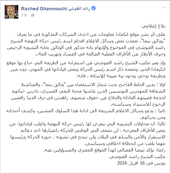 وعبّر مكتب راشد الغنوشي عن استغرابه من الطريقة التي صاغ بها موقع انكيفادا الخبر، وتعمده ذكر اسم رئيس الحركة وبعض قياداتها في المهجر، دون مبرر وبطريقة توحي بوجود نية مبيتة للإساءة ، حيث أدان الخلط الفاضح تحت شعار الاستقصاء بين "وثائق بنما"، والمناشط الشفافة للمهجرين التونسيين الذين عاشوا محنة النفي القسري، ناذرين حياتهم لخدمة قضيتهم العادلة والدفاع عن حقوق شعبهم، زاهدين في ترف الدنيا رافضين الرضوخ للاستبداد وسياسته.