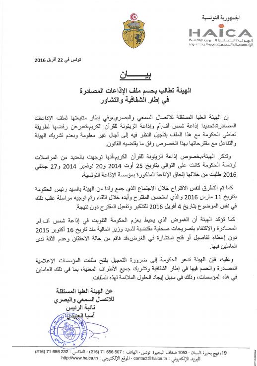 وعبرت الهيئة في بلاغها عن رفضها لطريقة تعاطي الحكومة مع ملف الإذاعات المصادرة وتحديدا إذاعة شمس أف أم وإذاعة الزيتونة للقرآن الكريم وذلك بتأجيل النظر فيه أجال غير معلومة وعدم تشريكها والتفاعل مع مقترحاتها بهذا الخصوص وفق ما يقتضيه القانون.