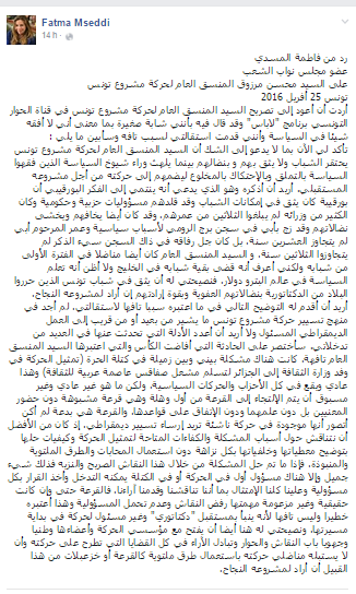 وتابعت فاطمة مسدي "أريد أن أقدم له التوضيح التالي في ما اعتبره سببا تافها لاستقالتي. لم أجد في منهج تسيير حركة مشروع تونس ما يشير من بعيد أو من قريب إلى العمل الديمقراطي المسئول ولا أريد أن أعدد الأدلة التي تحدثت عنها في العديد من تدخلاتي".