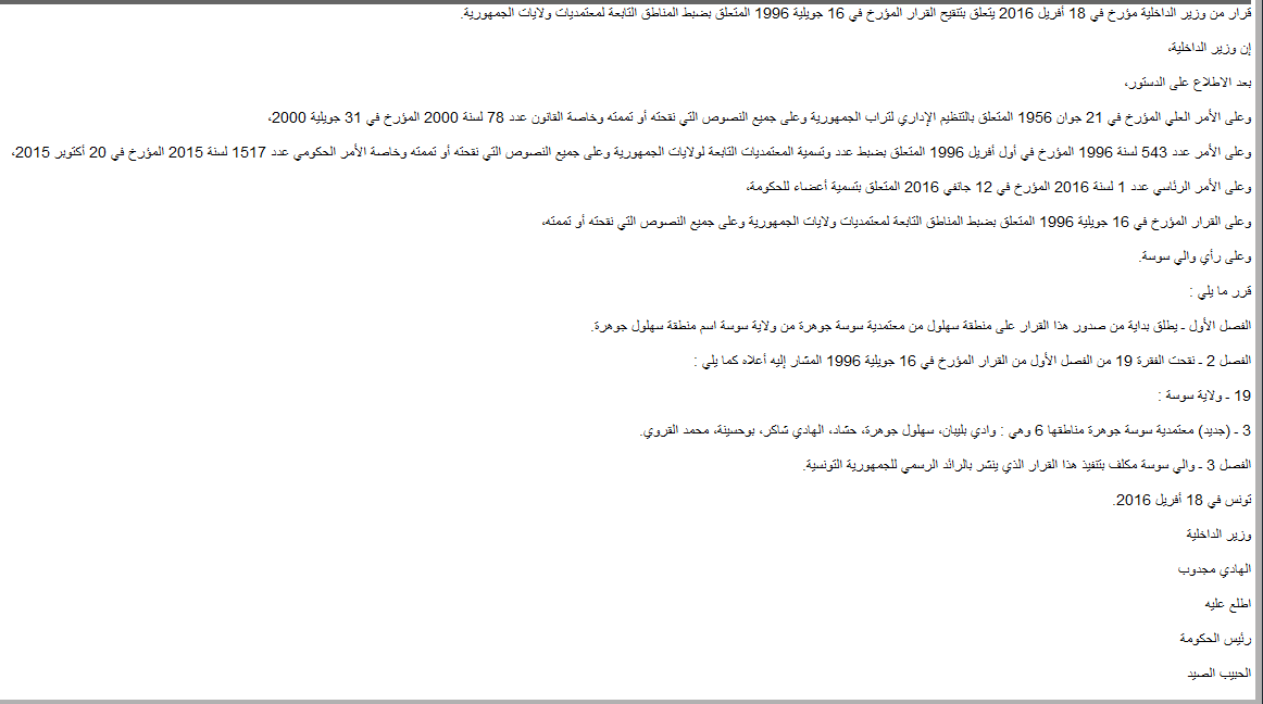 الفصل الأول ـ يطلق بداية من صدور هذا القرار على منطقة سهلول من معتمدية سوسة جوهرة من ولاية سوسة اسم منطقة "سهلول جوهرة".