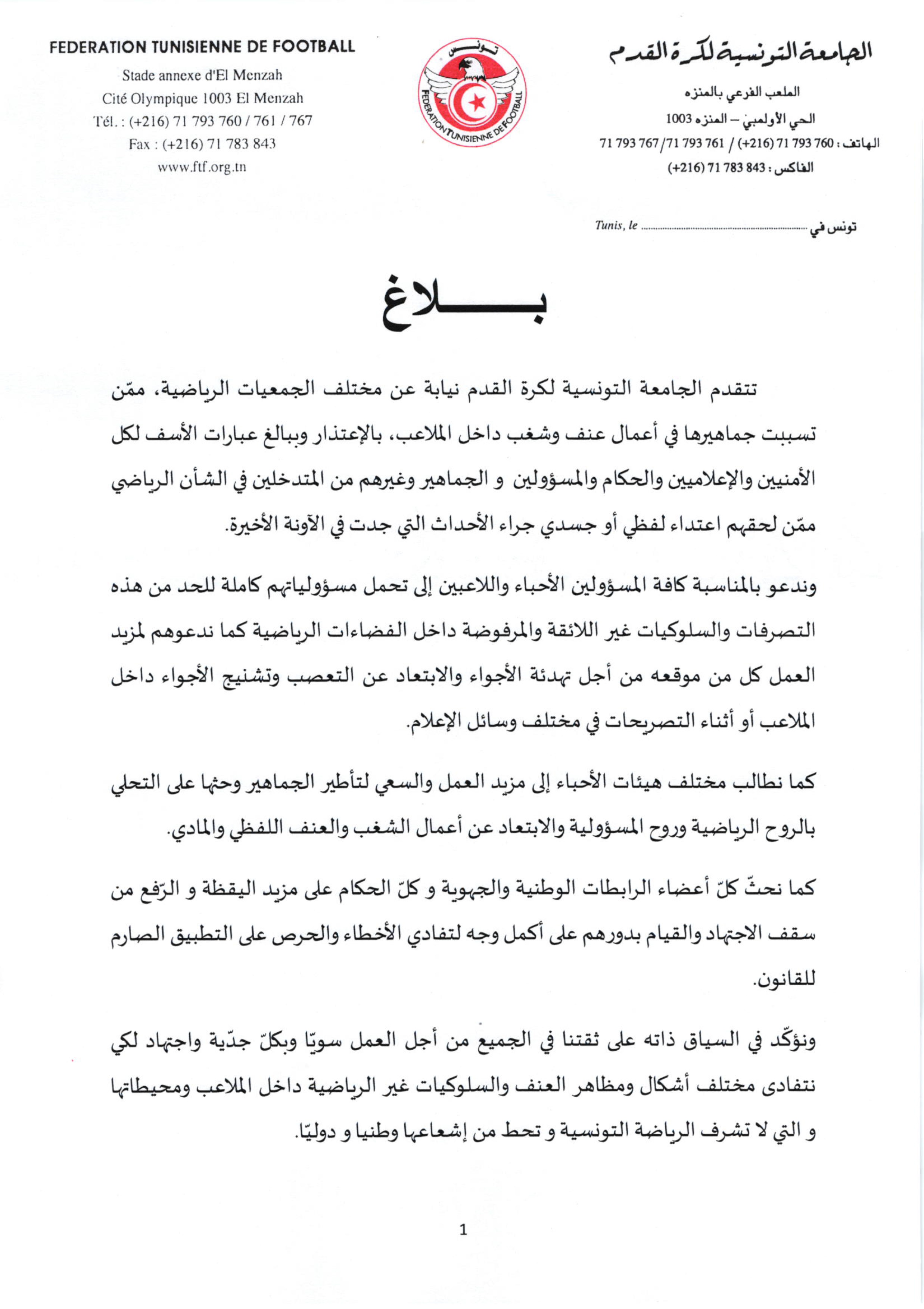 ودعت الجامعة كافة المسؤويلن والأحباء والهياكل الرياضية وهياكل التحكيم إلى تحمل مسؤولياتهم والحد من ظاهرة العنف في الملاعب والتصريحات المتشنجة في مخالف وسائل الاعلام.