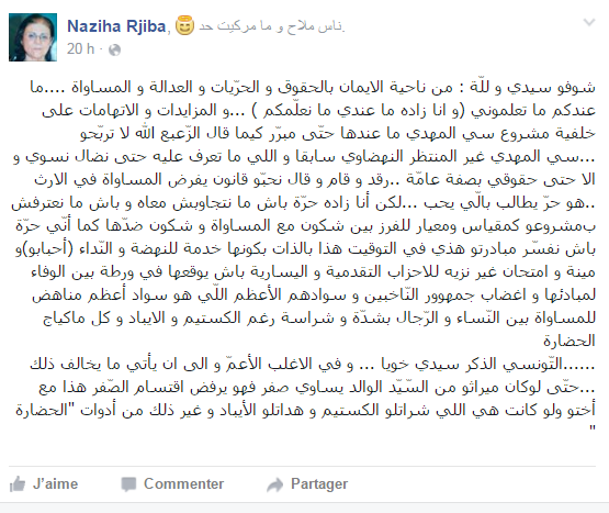 عبّرت الناشطة السياسية نزيهة رجيبة "أم زياد"، من خلال تدوينة نشرتها على صفحتها بالفايسبوك يوم الخميس 5 ماي 2016، عن رفضها للمبادرة التشريعية التي تقدم بها النائب بمجلس نواب الشعب مهدي بن غربية والتي تتعلق بالمساواة في الميراث بين الرجل والمرأة.