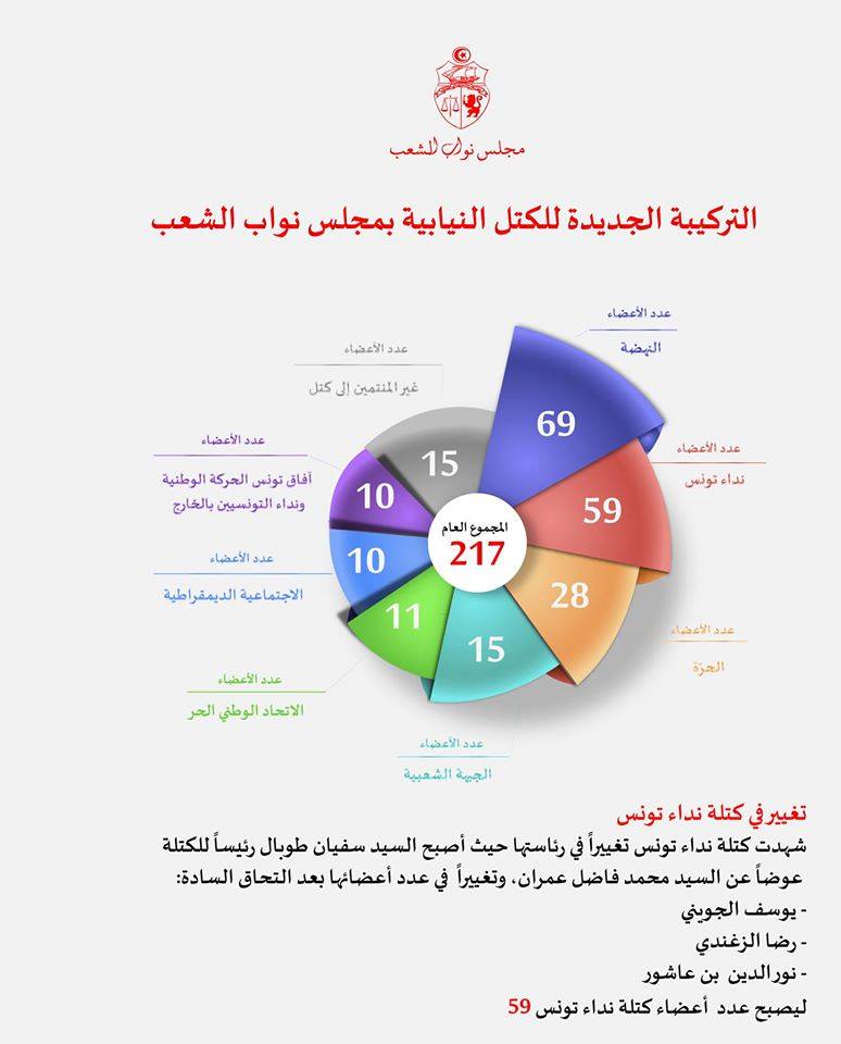 وأعلنت رئاسة مجلس الشعب أنّه أصبح عدد أعضاء كتلة نداء تونس 59 نائبا، فيما تضّم كتلة النهضة 69 نائبا.