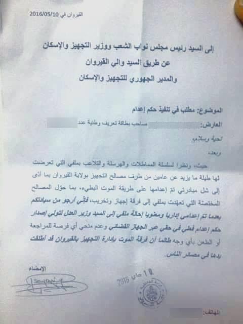 توجه أمس الثلاثاء 10 ماي 2016 مواطن أصيل ولاية القيروان برسالة الى رئيس مجلس النواب محمد الناصر و وزير التجهيز والإسكان مطالبا بتنفيذ حكم الإعدام في شخصه مع توجيه ملفه إلى وزير العدل لتولي اصدار حكم اعدامه وعدم تمكينه من أي فرصة للمراجعة أو الطعن.
