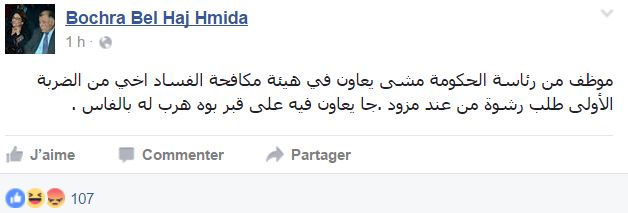 زووم - في تدوينة لها على حسابها الخاص على الفايسبوك، تحدثت النائبة بمجلس الشعب ، بشرى بلحاج حميدة ، منذ قليل عن موظف في رئاسة الحكومة طلب رشوة.