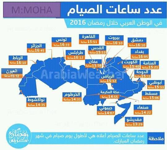ومن المنتظر أن يبلغ أقصى عدد لساعات الصيام بالوطن العربي قرابة الـ 17 ساعة، حيث ستحتل الجزائر المركز الأول بـ 16 ساعة و45 دقيقة، تليها تونس بـ 16 ساعة و33 دقيقة، ثمّ :