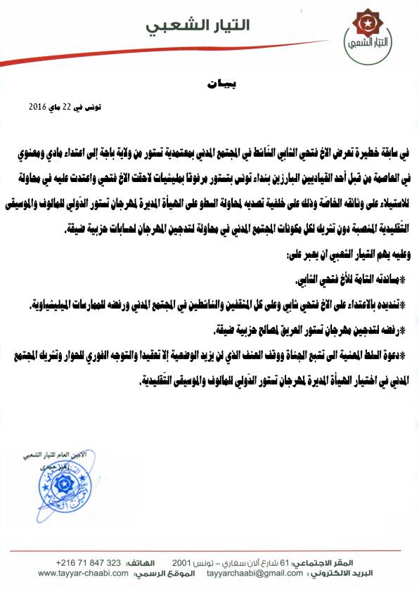 وأوضّح زهير حمدي أنّ أحد القياديين البارزين بحركة نداء تونس بتستور مرفوقا بمليشيات لاحقت فتحي الشابي واعتدت عليه في محاولة للاستيلاء على وثائقه الخاصّة وذلك على خلفية تصديه لمحاولة السطو على الهيئة المديرة لمهرجان تستور الدّولي للمالوف والموسيقى التّقليدية المنصبة دون تشريك لكل مكونات المجتمع المدني في محاولة لتدجين المهرجان لحسابات حزبية ضيقة، وفق نص البيان.