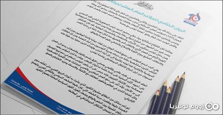 زووم - أصدرت حركة النهضة ، اليوم الأربعاء 25 ماي 2016 ، البيان الختامي للمؤتمر الإستثنائي العاشر الذي اِنعقد أيام 20، 21 و 22 من الشهر الجاري تحت شعار جامع "نهضة تونس مع بعضنا".