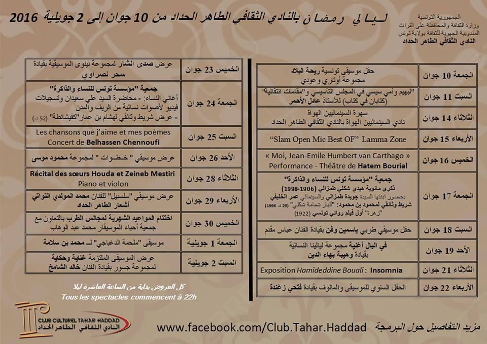 حيث ستؤثّث سهرات هذه التّظاهرة عروض موسيقيّة وسينمائيّة متنوّعة إضافة إلى المعارض الفنّية التّشكيليّة والفوتوغرافيّة والفعاليّات الثّقافيّة المختلفة.
