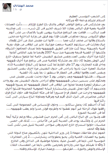وأشار الهنتاتي أنّه باستشارة النيابة العمومية تمّ اطلاق سراحه، مبيّنا أنّ من يقف وراء ما يتعرضّ له من ايقافات متتالية والتفتيش الدقيق من قِبل أمن الحرم والمضايقات في مكة المكرمة هي هذه الأطراف: بعض النقابات الأمنية بمعية فريد الباجيي ومازن الشريف، وفق تعبيره.