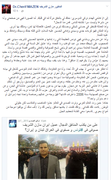 كما جاء في صحيفة الوئام السعودية، أنّ "مازن الشريف يقود مخطط إيراني للعبث بأمن تونس يقوده مازن الشريف، مبيّنة أنّ الشريف لديه مؤسسات في تونس وجمعيات تعمل تحت غطاء الصوفية مدعومة من إيران لنشر التشيع والتطبيل لإيران وتلميع حزب الله".