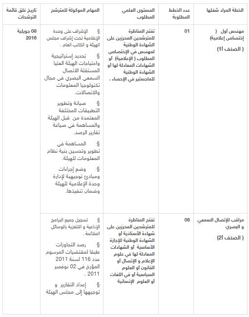 - خبرة لا تقل عن خمس سنوات بالنسبة لخطة مهندس في الإعلامية و تؤخذ بغين الإعتبار الخبرة في مجال الرصد بالنسبة لمراقبي الإتصال السمعي و البصري .