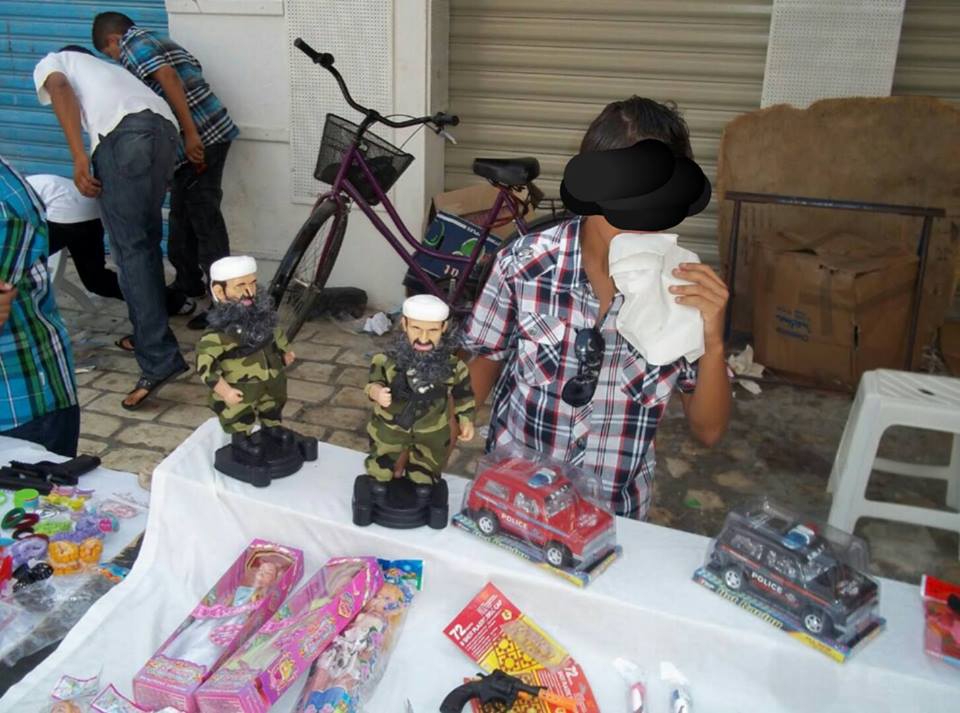 نشر المحامي عبد العزيز الحالي على صفحته الرسمية على الفايسبوك صورا لألعاب تُباع على قارعة الطريقة تُجسّد صورة زعيم تنظيم القاعدة أسامة بن لادن.