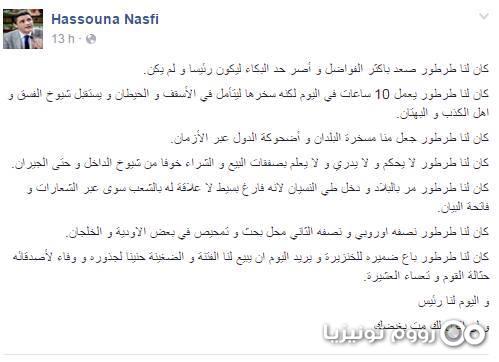 وقال الناصفي ، في تدوينة فايسبوكية ، أنّه كان لتونس "طرور" صعد بأكثر الفواضل وأصرّ حدّ البكاء ليكون رئيساً ، كما أنّه عمل 10 ساعات في اليوم كما قال ولكنه سخرها للتأمل في الأسقف وإستقبال شيوخ الفسق وأهل الكذب والبهتان.
