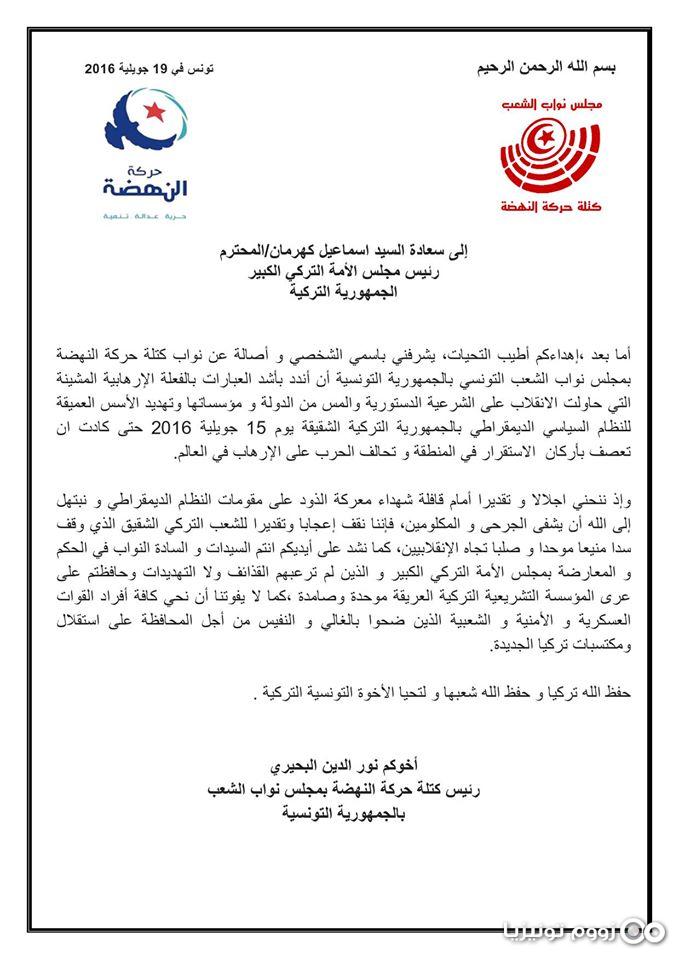 وقد ندّد البحيري ، خلال رسالته، بأشد العبارات بهذه الفعلة الاِرهابية المشينة التي حاولت الانقلاب على الشرعية الدستورية والمسّ من الدولة ومؤسساتها وتهديد الأسس العميقية للنظام السياسي الديمقراطي بالجمهورية التركية.
