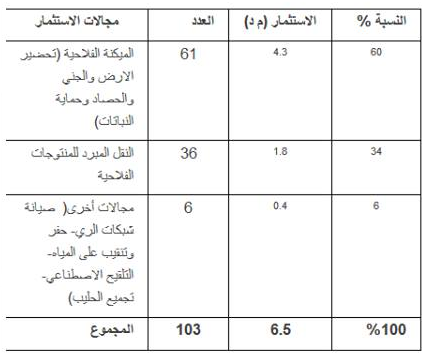 وتمثل الاستثمارات المقترحة في أنشطة الميكنة الفلاحية و النقل المبرد لمنتوجات الفلاحة و الصيد البحري أكثر من 94 % من مجموع الاستثمارات المزمع انجازها في قطاع الخدمات الفلاحية.