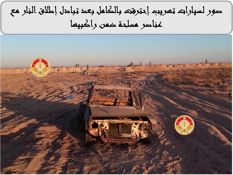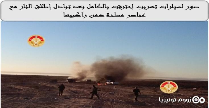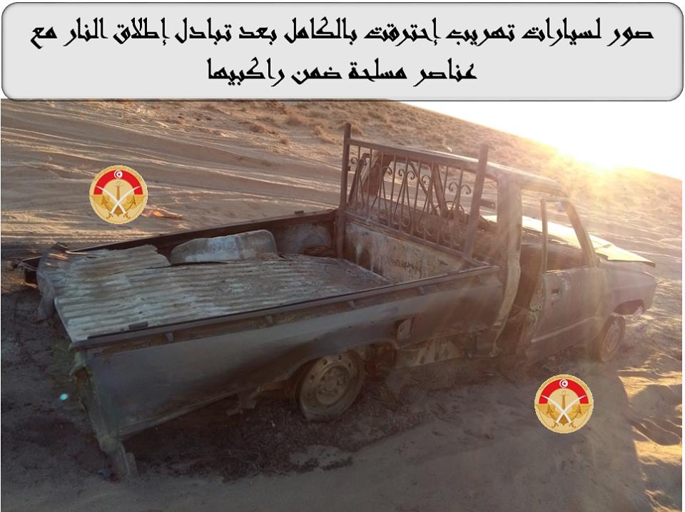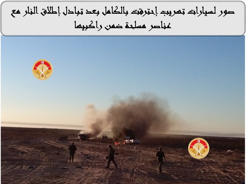 ووفق نص البلاغ الصادر عن وزاؤة الدفاع الوطني فقد تم تبادل إطلاق النار معها مما أسفر عن إحتراق 3 سيارات بالكامل فيما رجعت بقية السيارات إلى التراب الليبي.