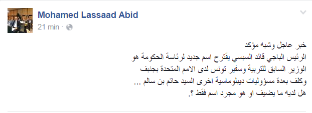 وأضاف العبيدي ، في تدوينة على الفايسبوك، أنّ هذا الخبر شبه مؤكّد .
