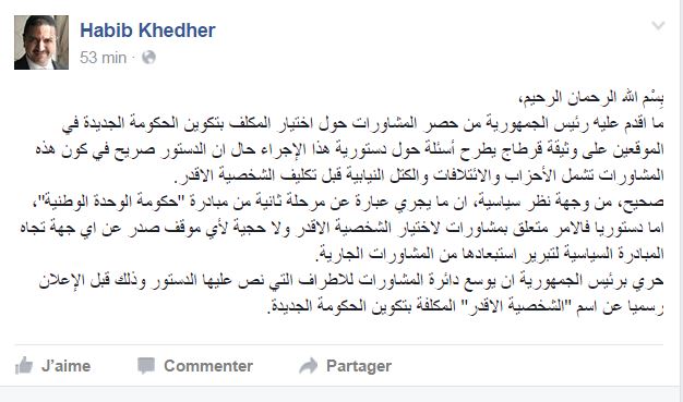 وبيّن الحبيب خضر أنّه كان "حري برئيس الجمهورية أنّ يوسع دائرة المشاورات للأطراف التي نص عليها الدستور وذلك قبل الإعلان رسميا عن اسم "الشخصية الأقدر" المكلفة بتكوين الحكومة الجديدة".