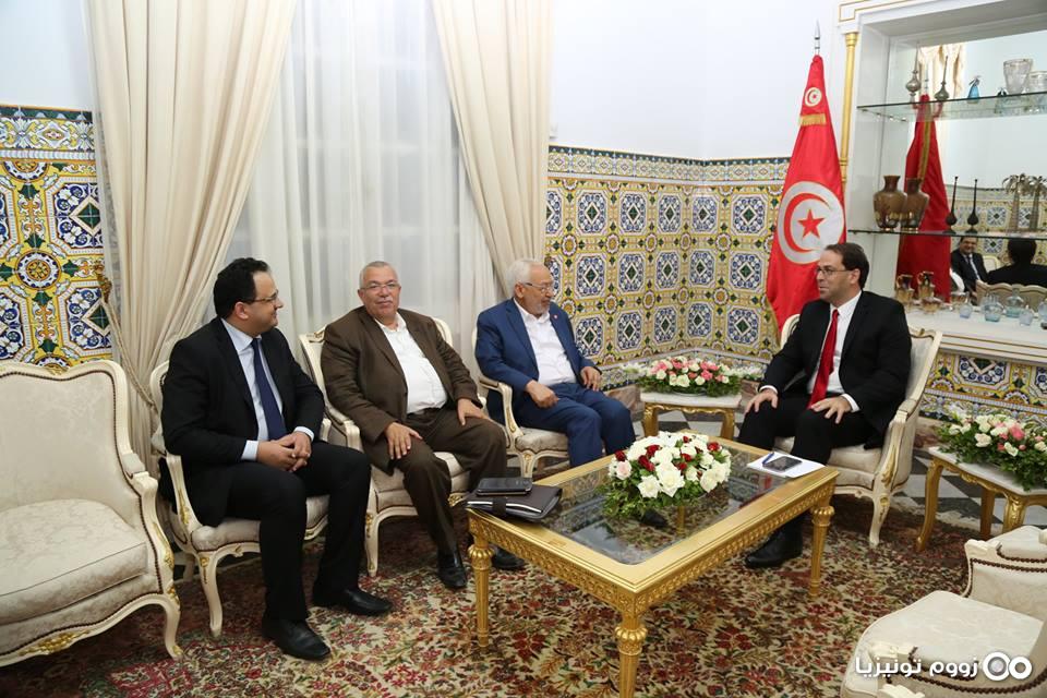 وقد أدلى الغنوشي بتصريح عقب اللقاء ، أكد فيه حرص حركة النهضة على إنجاح مبادرة تشكيل حكومة وحدة وطنية ملتزمة بالخيارات الكبرى المعلنة وفي مقدمتها محاربة الفساد والإرهاب وتفعيل برامج التنمية الجهوية والمحلية.
