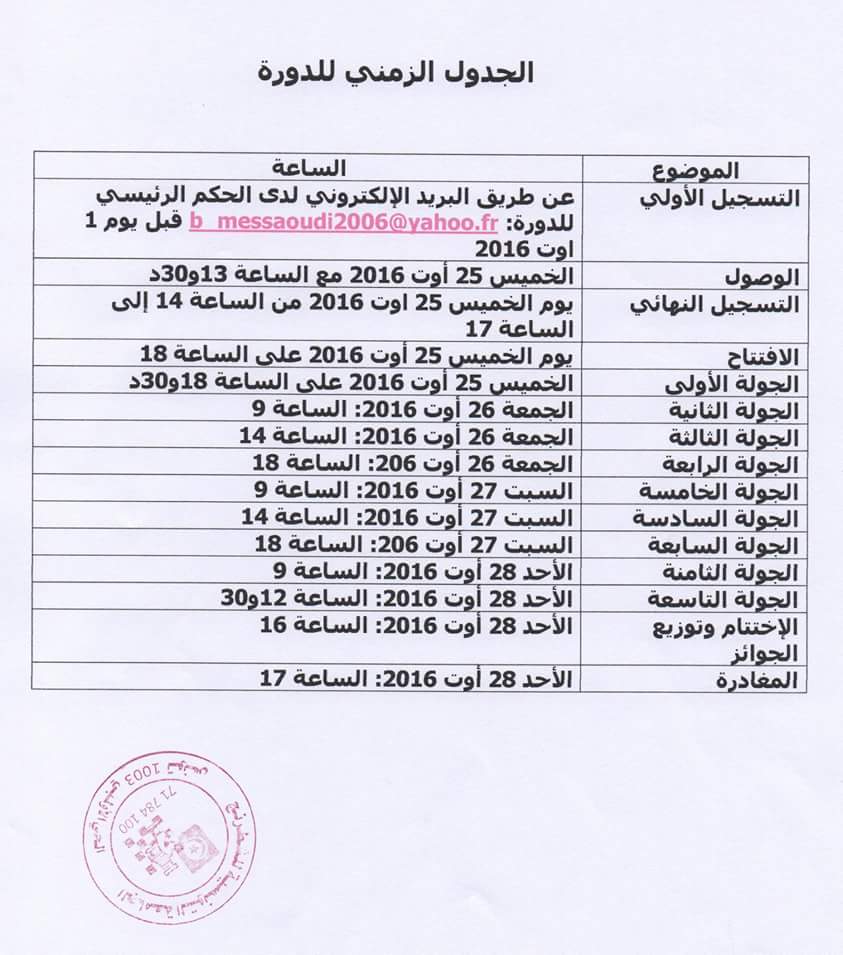 وبناء عليه، على المؤسسات الراغبة في المشاركة تقديم القوائم إلى المصالح ذات النظر قبل يوم 12 أوت 2016 وإرسال نسخة من القائمة للحكم الرئيس للبطولة المحاضر الدولي بشير مسعودي b_messaoudi2006@yahoo.fr وتتولى المندوبيات الجهوية تجميع القوائم وإرسالها للوزارة قبل يوم 18 أوت 2016 ثم الإعداد اللوجيستي لنقل الوفود.