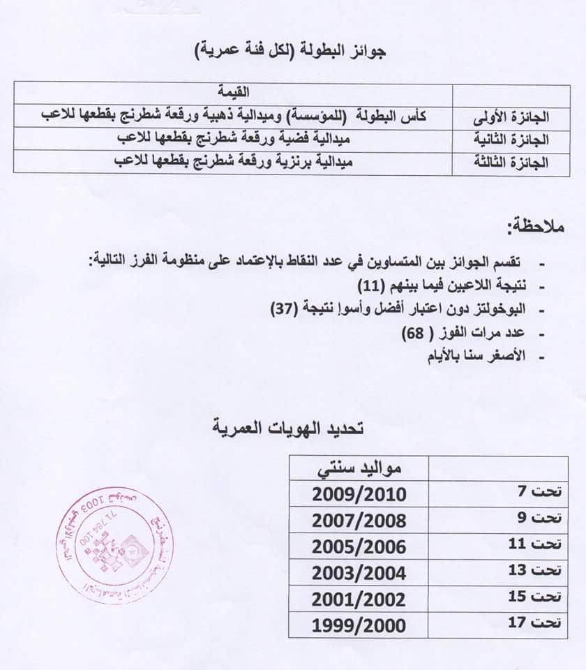 يمكن مبدئيا لكل نادي من نوادي الشطرنج الناشطة بالمؤسسات التربوية المشاركة على أقصى تقدير بلاعبين في كل من الفئات العمرية الاثنتي عشر التالية: تحت 7 أعوام بنات وتحت 7 أعوام بنين ، تحت 9 أعوام بنات وتحت 9 أعوام بنين ، تحت 11 عاما بنات وتحت 11 عاما بنين ، تحت 13 عاما بنات وتحت 13 عاما بنين، تحت 15 عاما بنات وتحت 15 عاما بنين و، تحت 17 عاما بنات وتحت 17 عاما بنين ويعتمد 1 جانفي 2016 لتحديد الفئة العمرية.