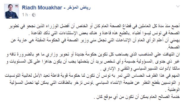 وفي هذا السياق، قال القيادي بحزب آقاف تونس رياض المؤخر، عبر تدوينة على صفحته الخاصة على الفايسبوك اليوم السبت 13 أوت 2016، أنّ "الإشاعات التي تجعل مني وزير الصحة في الحكومة المقبلة هي عارية عن الصحة".