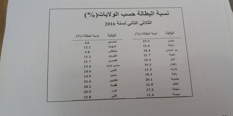 و اِحتلت ولاية تطاوين المرتبة الأولى من حيث إرتفاع البطالة بـ32 بالمائة، تليها قفصة بـ28.2 بالمائة، ثم قبلي بـ25.8 بالمائة.