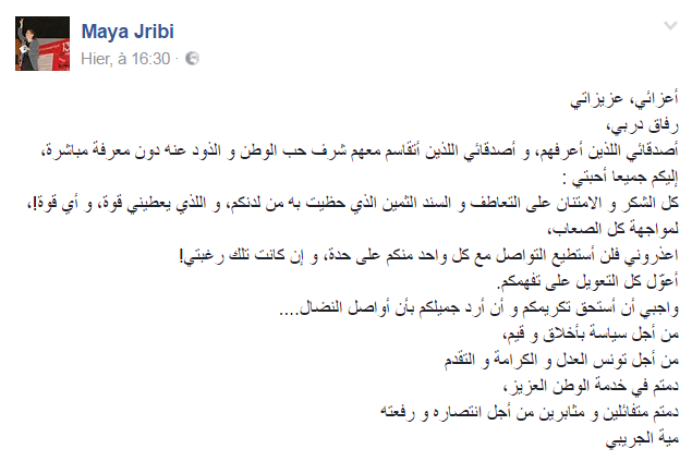 وقالت ميّة الجريبي أنّها تُريد التواصل معهم كل واحد على جدة ولكنها لا تستطيع، مؤكّدة أنّ واجبها أن تستحق تكريمهم وتردّ لهم الجميل وذلم بمواصلة النضال من أجل سياسة بأخلاق وقيم ومن أجل تونس العدل والكرامة والتقدّم، وفيما يلي نص الرسالة كامل والذي نشرته على حسابها الرسمي على الفايسبوك :