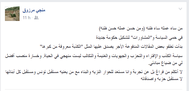 وأضاف مرزوق ، في تدوينة على حسابه الخاص على الفايسبوك، أنّ سياسة الكذب والإفتراء والتحزب والجهويات والغنيمة والتكالب ليست منهجه في الحياة، و أنّ خسارة منصب أفضل له من ضياع مبادئه.