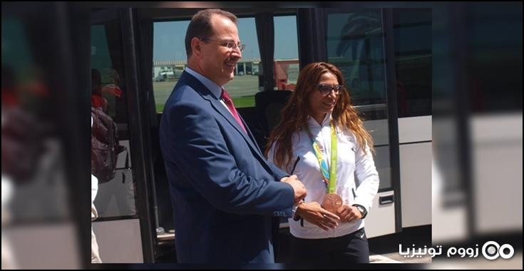 وقد كان في اِستقبال البطلة وزير الشباب والرياضة ماهر بن ضياء، وذلك بالقاعة الشرفية بمطار تونس قرطاج الدولي، بمعية رئيس اللجنة الوطنية الاولمبية محرز بوصيان ورئيس الجامعة التونسية للمصارعة فرجاني رحومة ورئيس الجامعة التونسية لكرة السلة علي البنزرتي وعدد من اطارات الوزارة وثلة من الوجوه الرياضية والاعلامية.