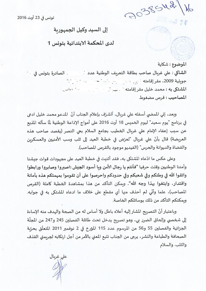 رفع اليوم الإمام علي غربال دعوى قضائية ضد وزير الشؤون الدينية محمد خليل بصفته الشخصية بتهمة الثلب والقذف وتوجيه التهم الباطلة إلى شخصه بعد ظهوره الأخير على أمواج الإذاعة الوطنية في برنامج "يوم سعيد" مع المنشط حاتم بن عمارة، حيث وجه إلي المدعو محمد خليل زورا وبهتانا تهمة التحريض على القتل وسب الأمن والجيش والحرس والديوانة والقضاء.